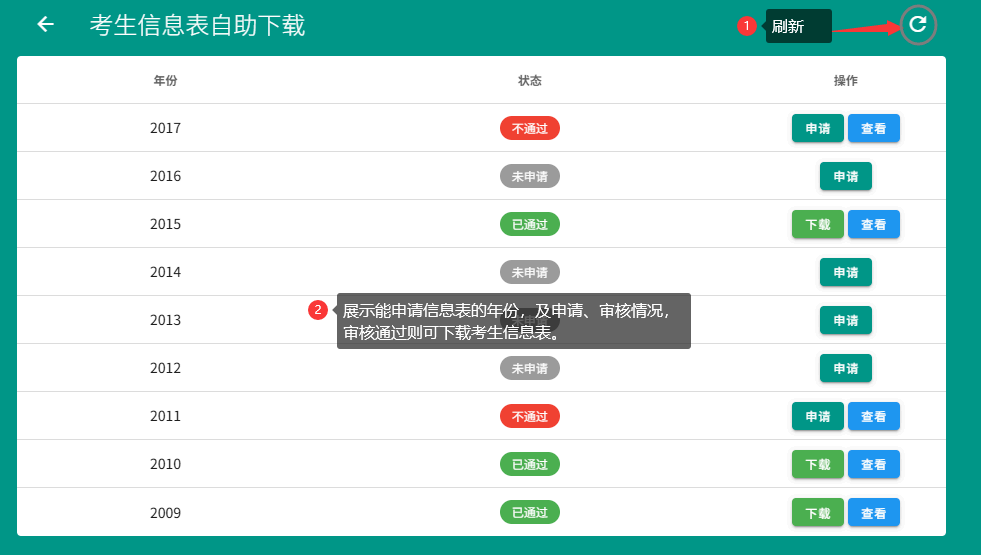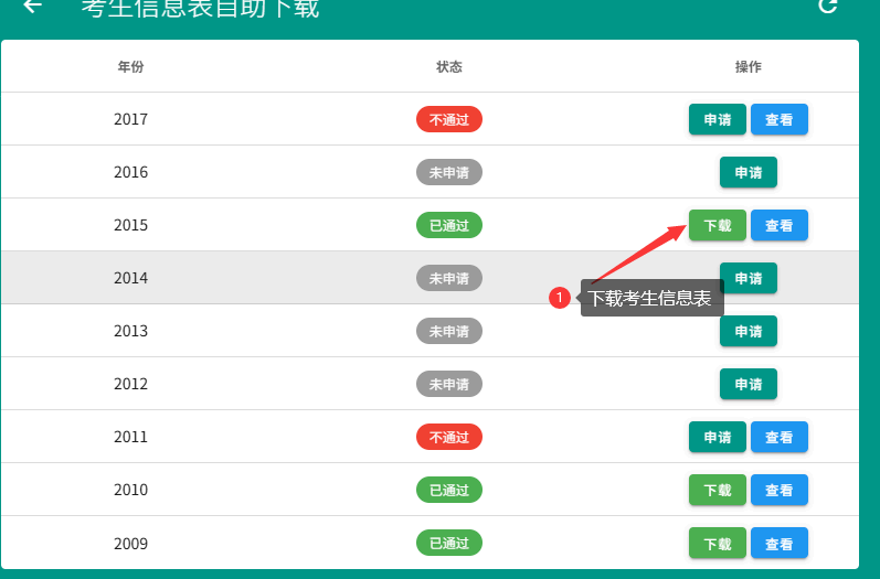 2. 审核通过后可下载考生信息表,若审核未通过,可根据提示修改资料后重新提交。
