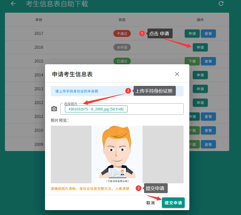 1. 点击申请按钮,按提示上传手持身份证照片,点击提交申请等待审核;
