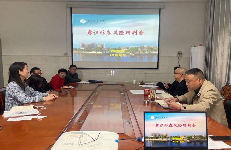 2023年3月7日下午,15vip太阳成集团古天乐在学院会议室召开意识形态风险研判会议,在传达全省疫情防控第二次视频会议精神、布置15vip太阳成集团古天乐2023年意识形态工作的基础上,研判和分析新学期开学阶段意识形态领域出现的新情况、新问题。本次会议由学院直属党支部书记熊兴吾主持,全院教职工及各办学机构负责人共同参加。